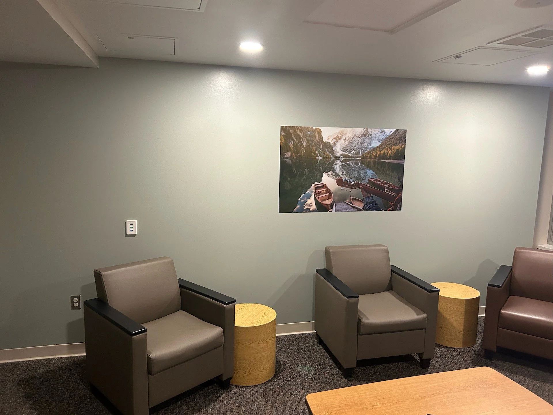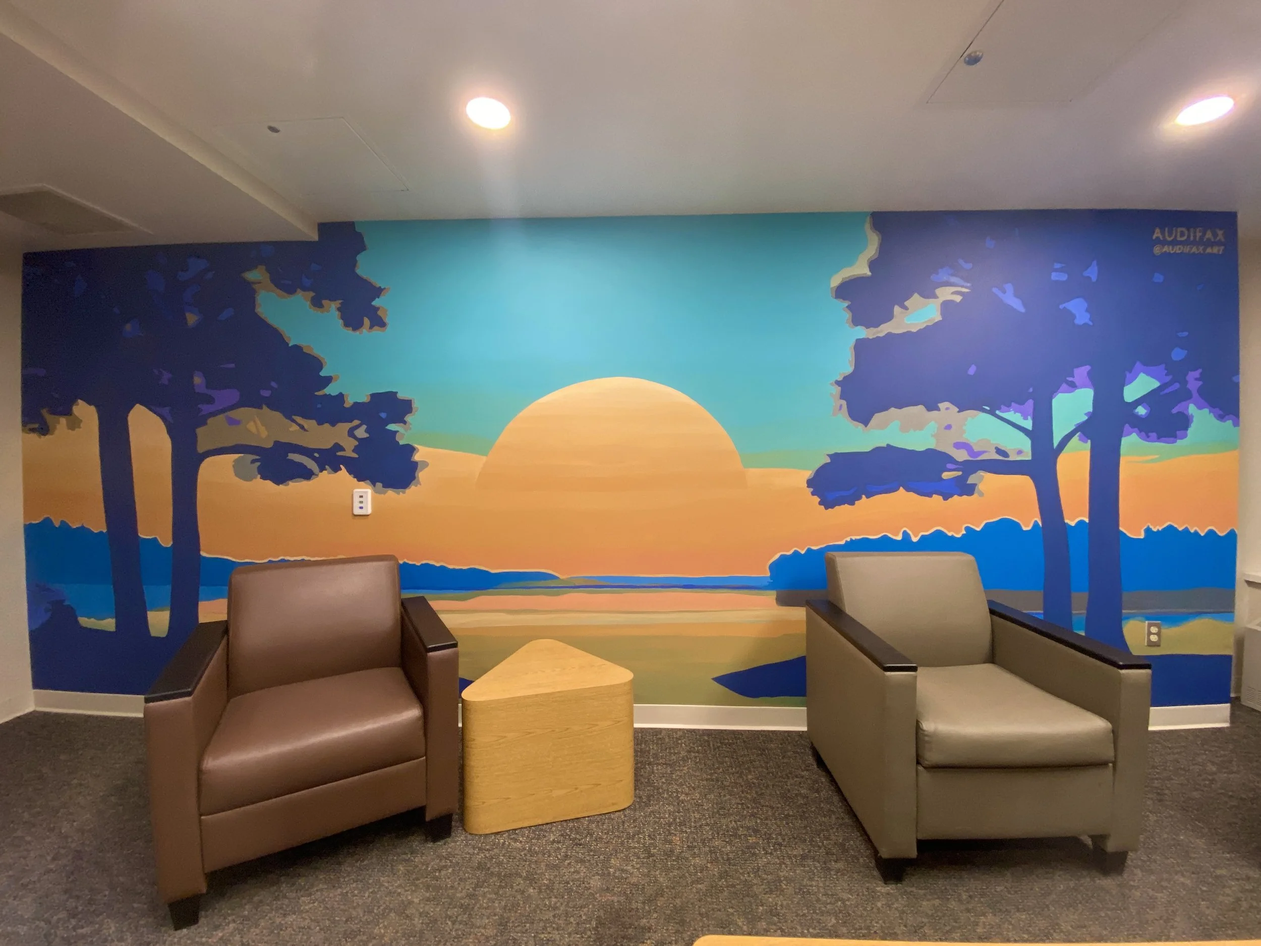 I had the honor of creating a mural for the group room in the Adult Psychiatry program at Unity Point Meriter Hospital in Madison, WI. The room is used for various group sessions, including educational and relaxation activities, all designed to support healing for patients in need of psychiatric care. They were looking for a soothing, comforting, safe, and welcoming feel. This brought about a discussion that a calming landscape with gold and turquoise tones would work best.