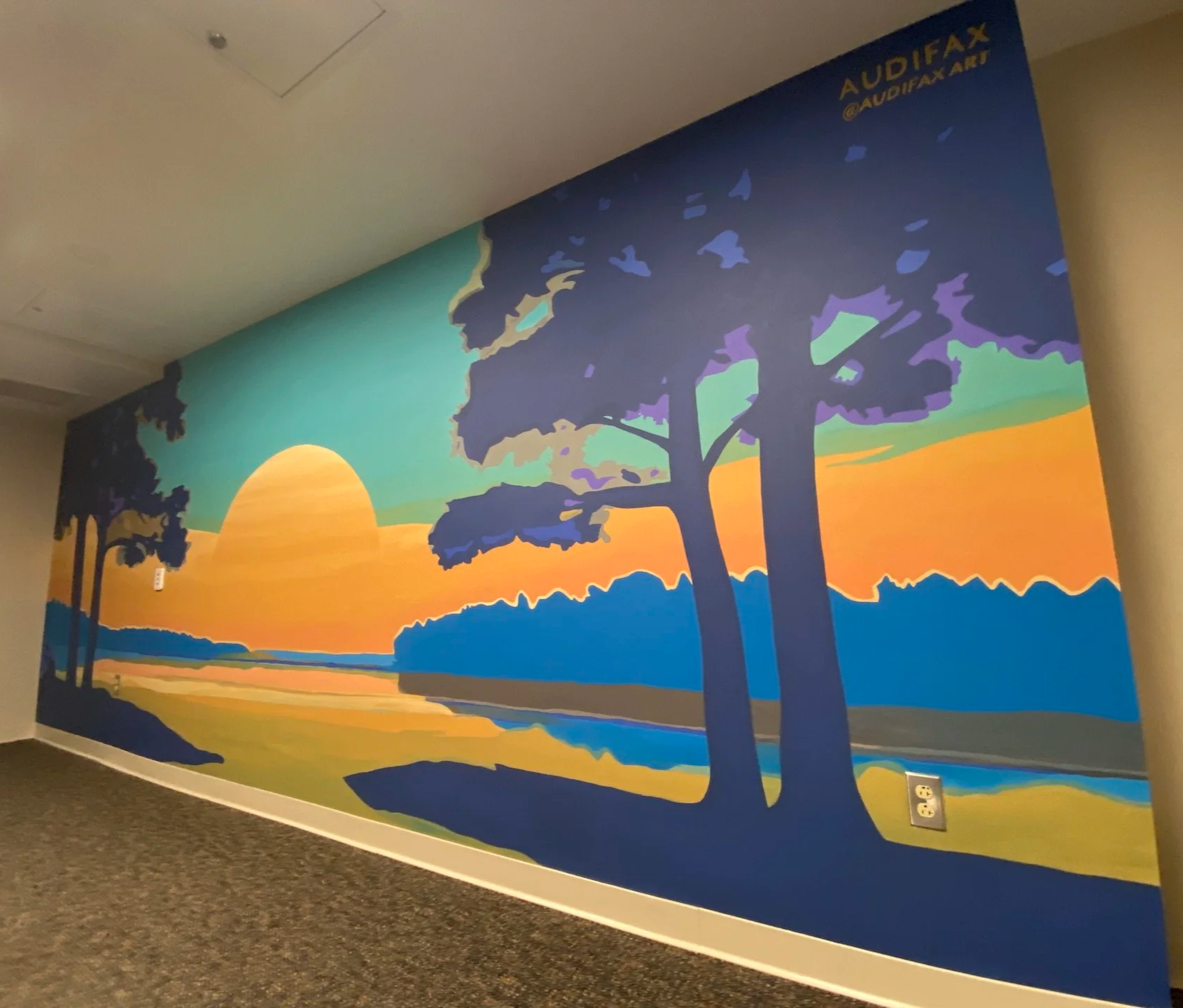 The image reflects an openness and brings a sense of peace. The sunrise is a sign of a new dawn, with nature embracing us through the scene. The beautiful colors speak to us with a vibrancy and joy, while invoking tranquility. I hope this mural brings a rejuvenating connection within for all those who see it.